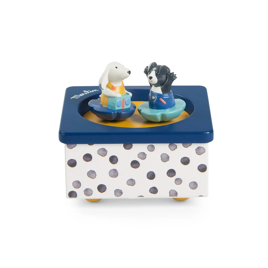 Indispensable dès la naissance, cette charmante boite à musique magnétique de la collection Puce et Pilou de Moulin Roty accompagnera les premiers instants de votre bébé. Les figurines de Puce et Pilou tourbillonnent gracieusement sur l’air de “Un week-end à Rome” d’Étienne Daho, créant une atmosphère apaisante pour l’endormissement. Les personnages Puce et Pilou, deux amis chiens, aiment se balader dans la ville, dans un décor des années 90. La collection utilise des couleurs originales et tendance, des graphismes frais, dans un style typique de Moulin Roty