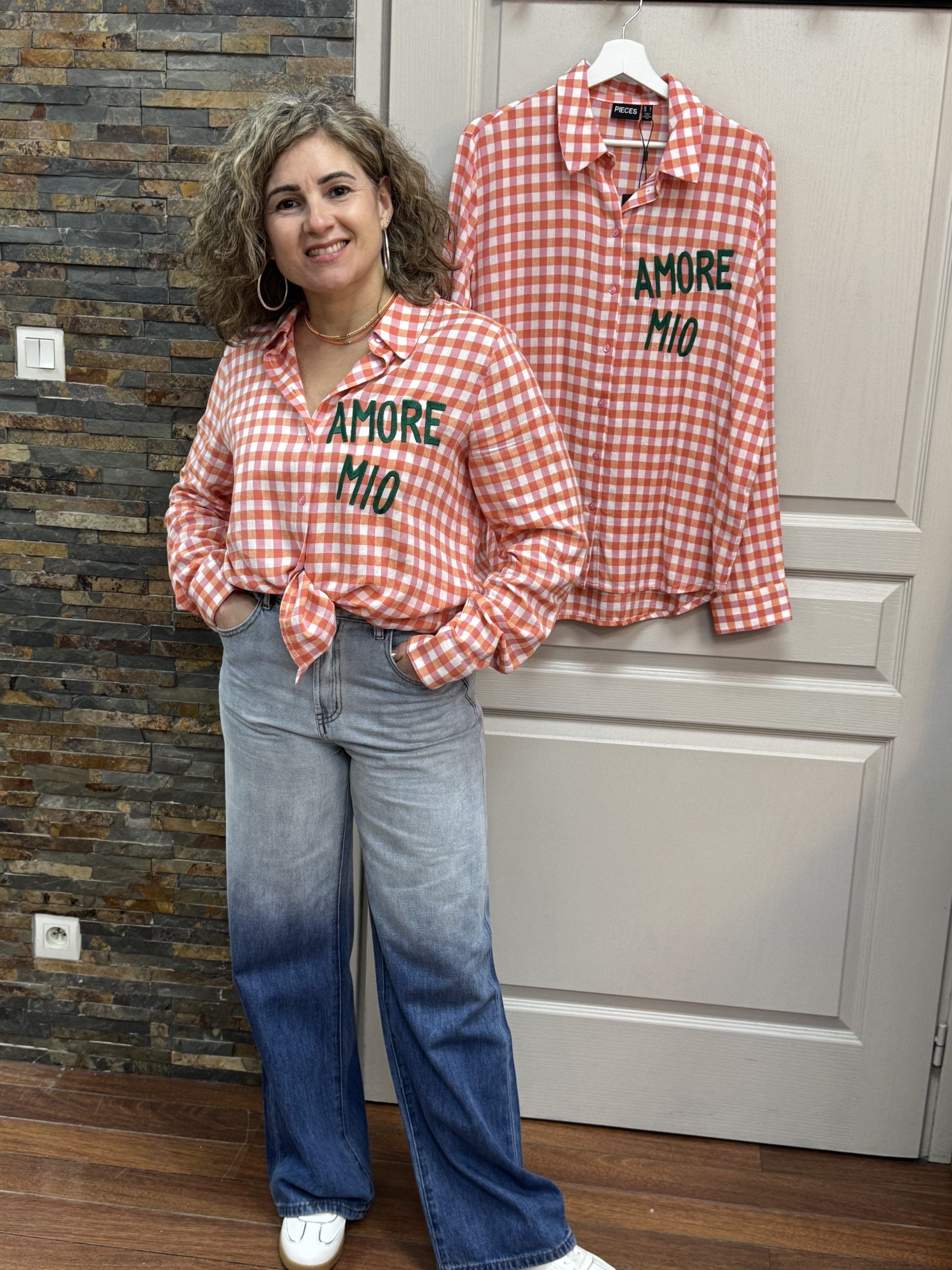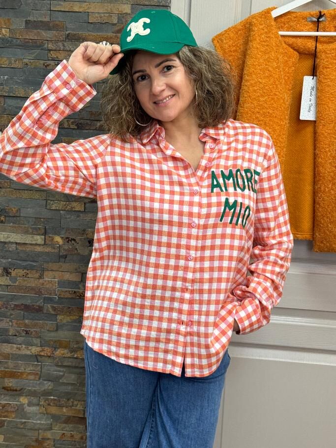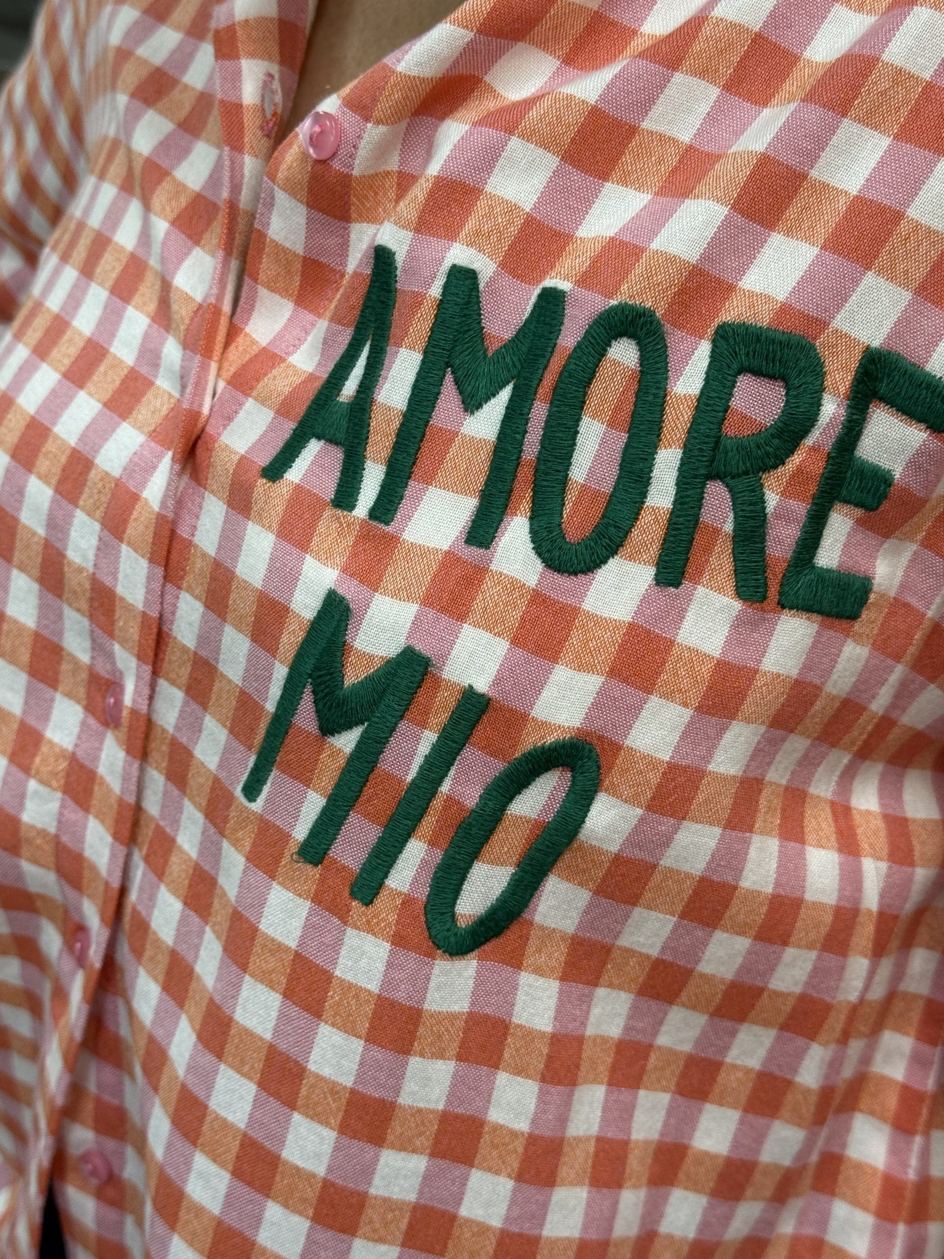 Une belle chemise à carreaux colorées, on adore l’écriture “AMORE MIO”!