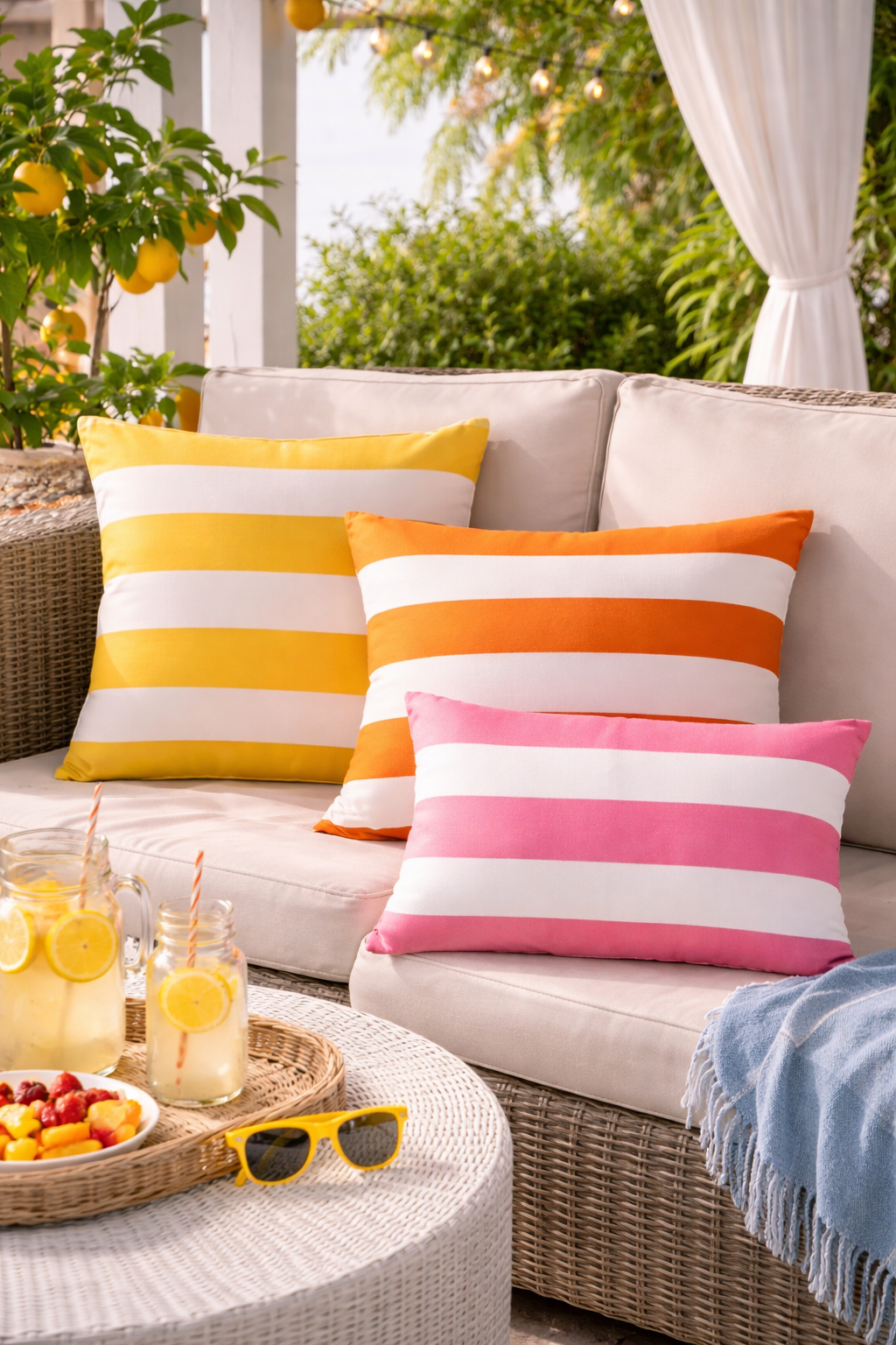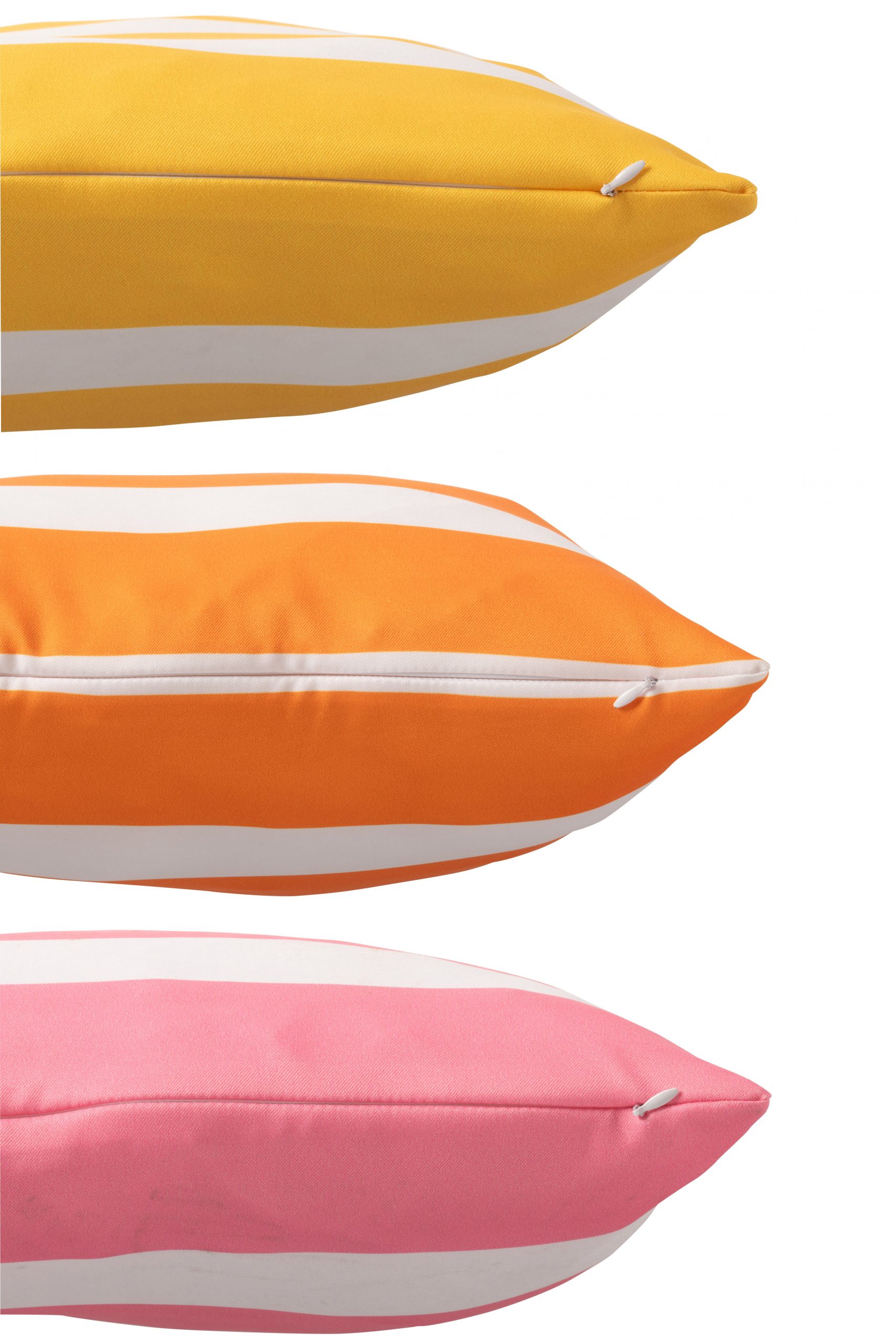 Avec leurs rayures modernes et leurs couleurs lumineuses (Orange , Rose, Jaune), ils habillent parfaitement un salon de jardin, une terrasse ou un balcon. Leur style intemporel s’accorde facilement avec tous les univers, du bord de mer au jardin bohème.