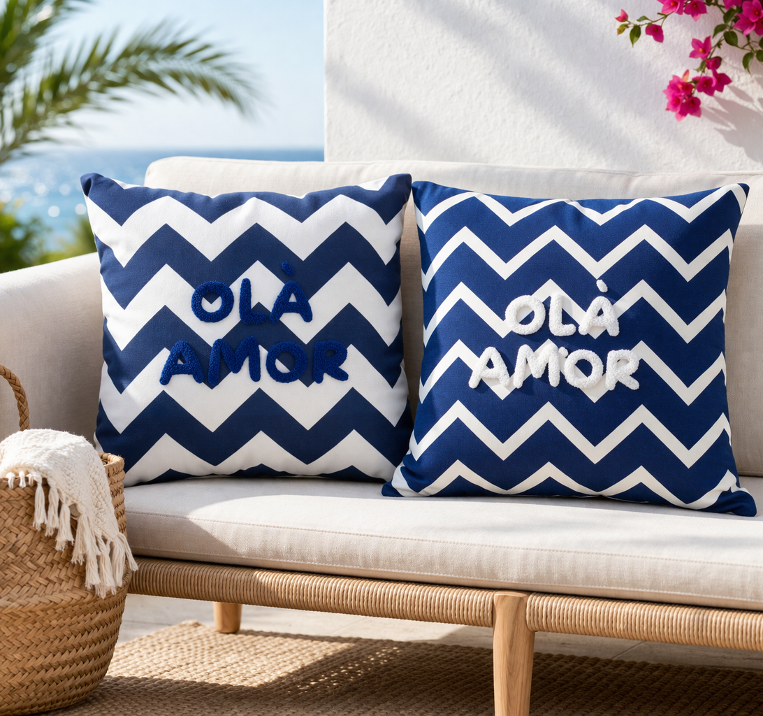 Invitez une touche romantique et méditerranéenne dans votre intérieur avec ces élégants coussins “Olá Amor”.