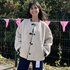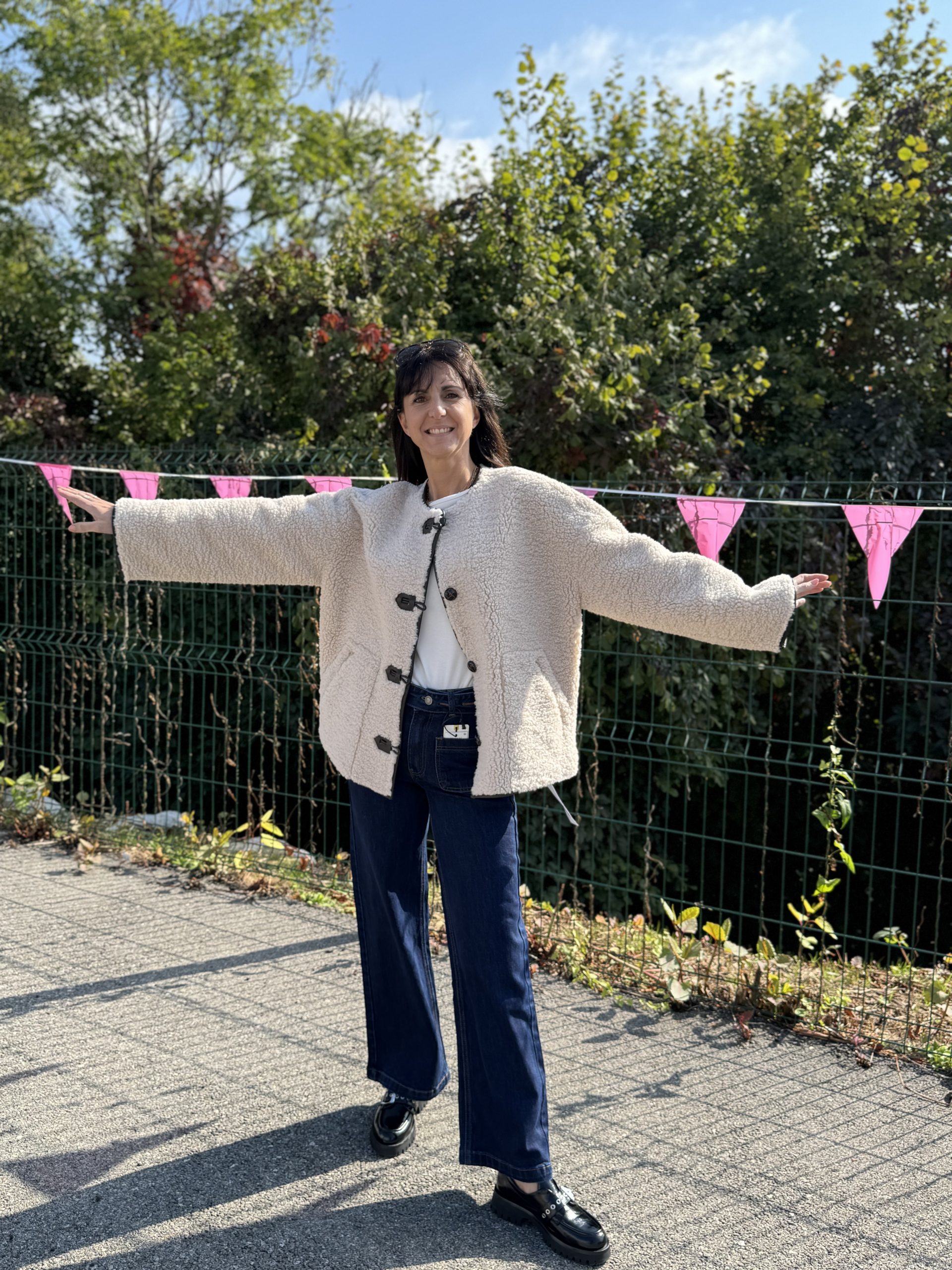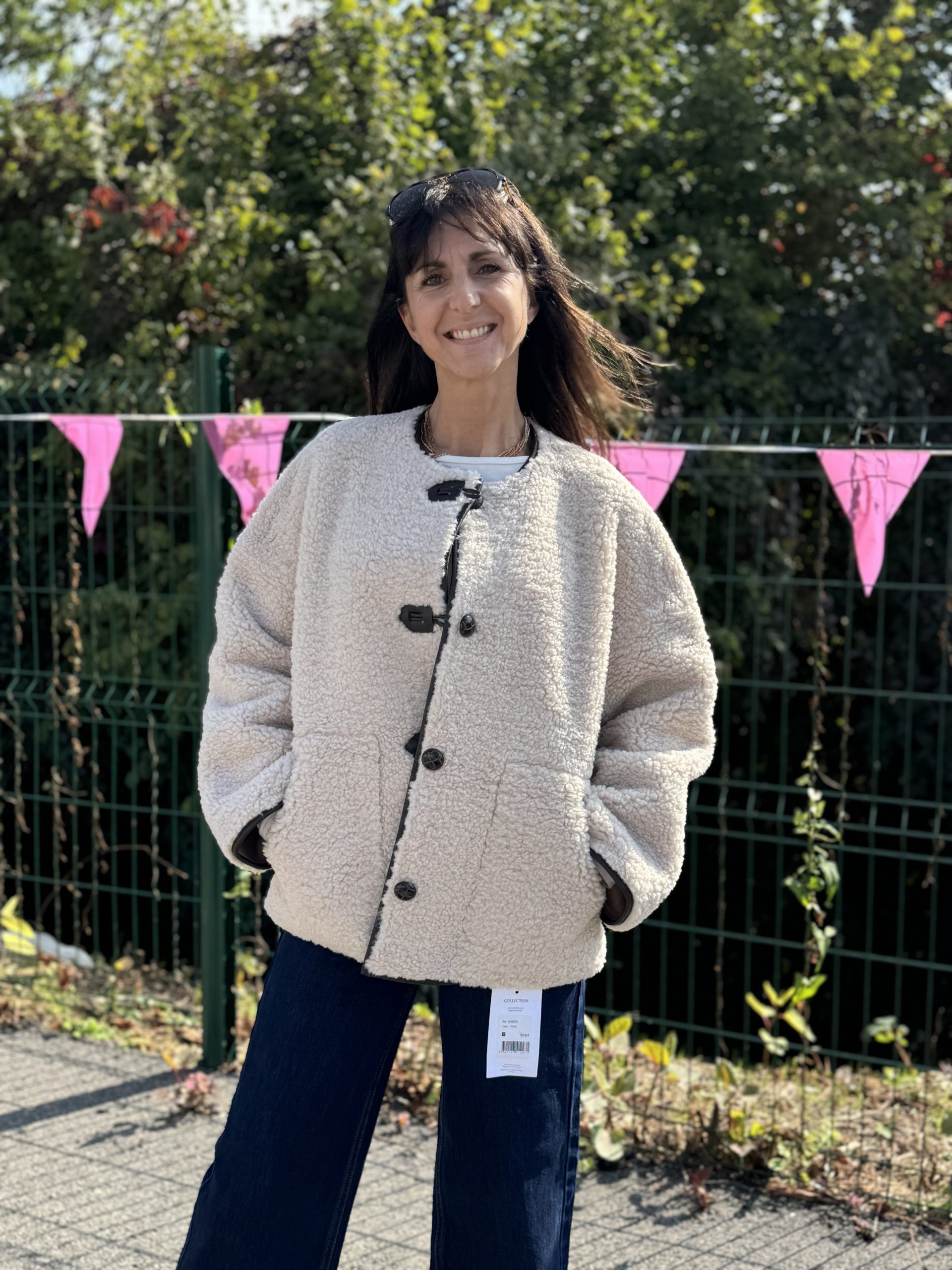 – Détail de liserés contrastés sur le devant, au col, aux poches et en bas de manches