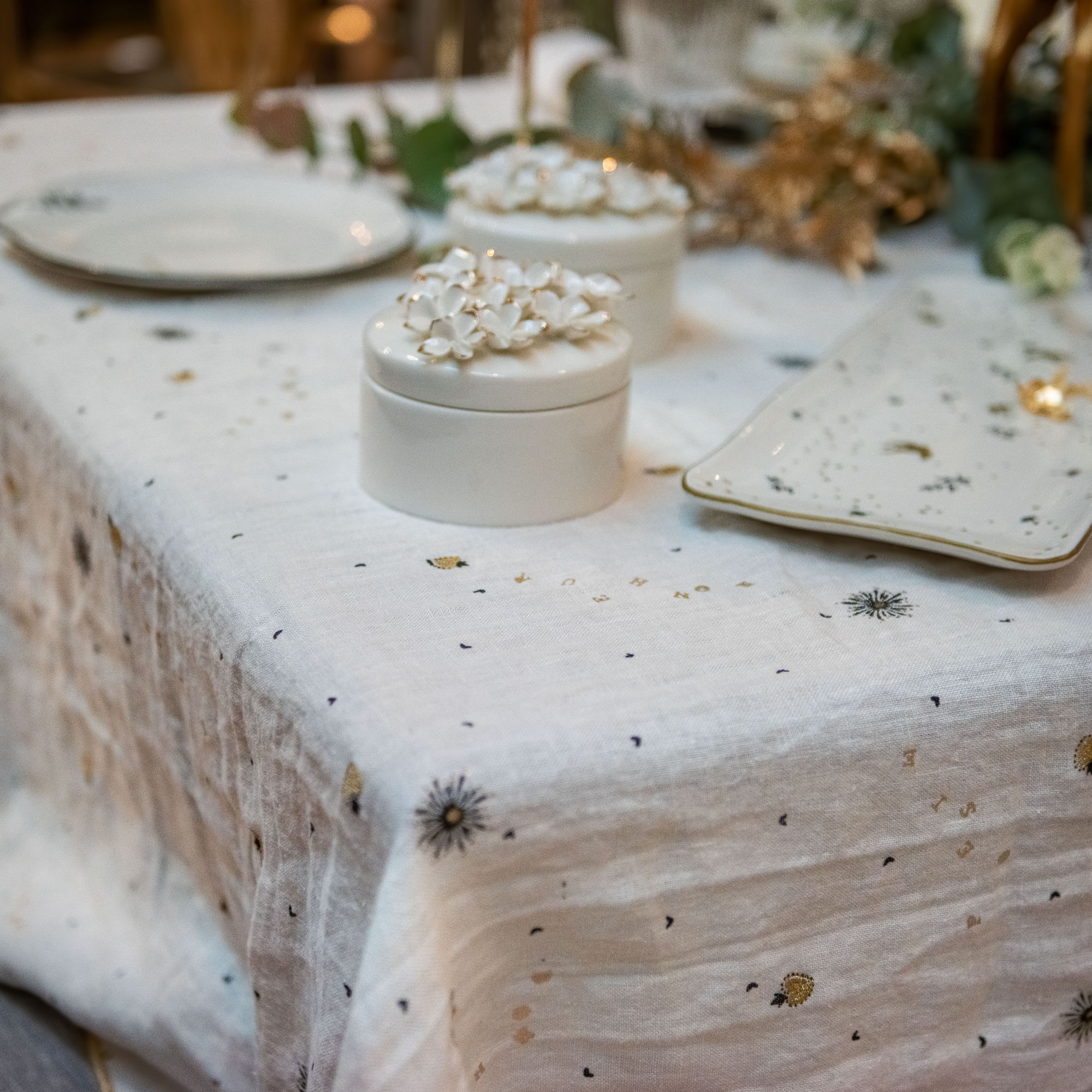Découvrez notre somptueuse nappe Poésie de 150×250 cm, une véritable œuvre d’art textile qui allie élégance et raffinement. Confectionnée avec une fusion de viscose et de lin, cette nappe blanche est rehaussée de subtils accents dorés et noirs. Chaque détail de cette création a été méticuleusement pensé pour évoquer une atmosphère enchanteresse et poétique. Elle apportera une touche d’élégance et de sophistication à toutes vos occasions spéciales, tout en créant une ambiance inoubliable.