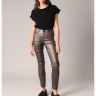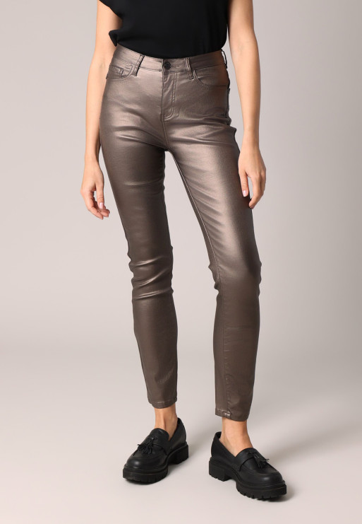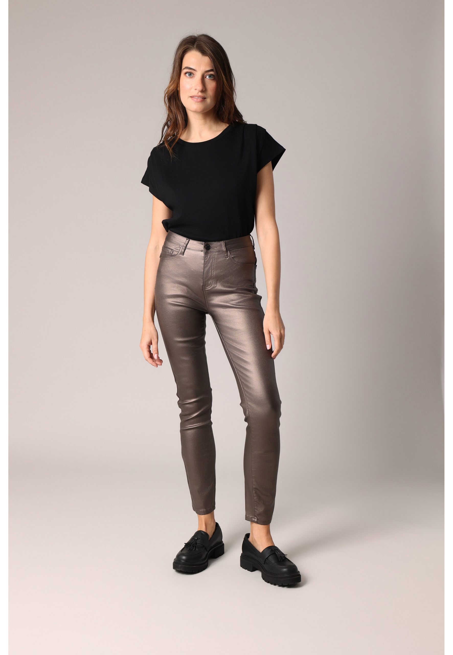 Ce pantalon slim taille haute se distingue par son fini métallisé brillant, parfait pour illuminer vos looks du jour comme de nuit. Sa coupe près du corps épouse élégamment la silhouette tout en conservant une belle liberté de mouvement. Doté de cinq poches et d’une fermeture zippée avec bouton, il combine allure urbaine et touche glam assumée.