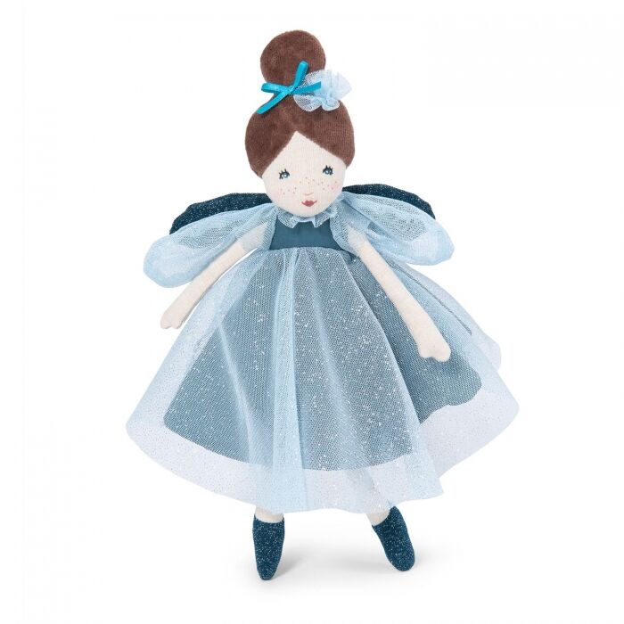 Petite fée en tissu chambray, au visage délicat brodé et sérigraphié, coiffée d’un chignon de velours noué de satin. Cette poupée Moulin Roty de 25 cm est vêtue d’une robe bleu nuit avec tulle pailleté argent et ailes de fée dans le dos, et de petits chaussons brillants.