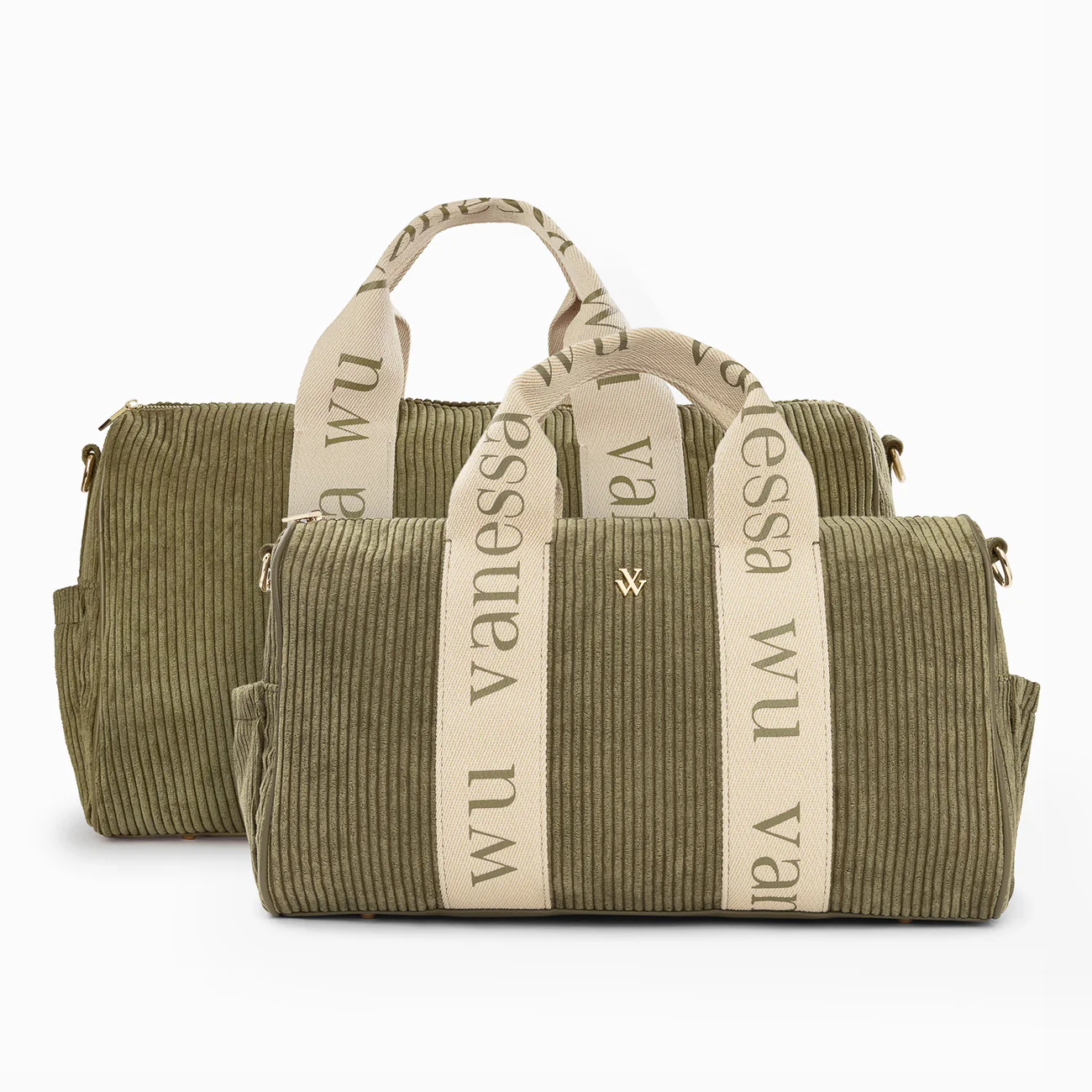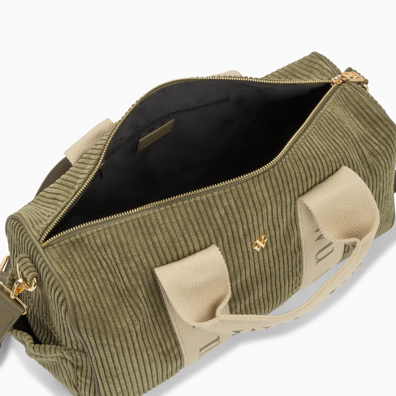 – Bandoulière amovible réglable en similicuir vert kaki, à boucle et mousquetons dorés