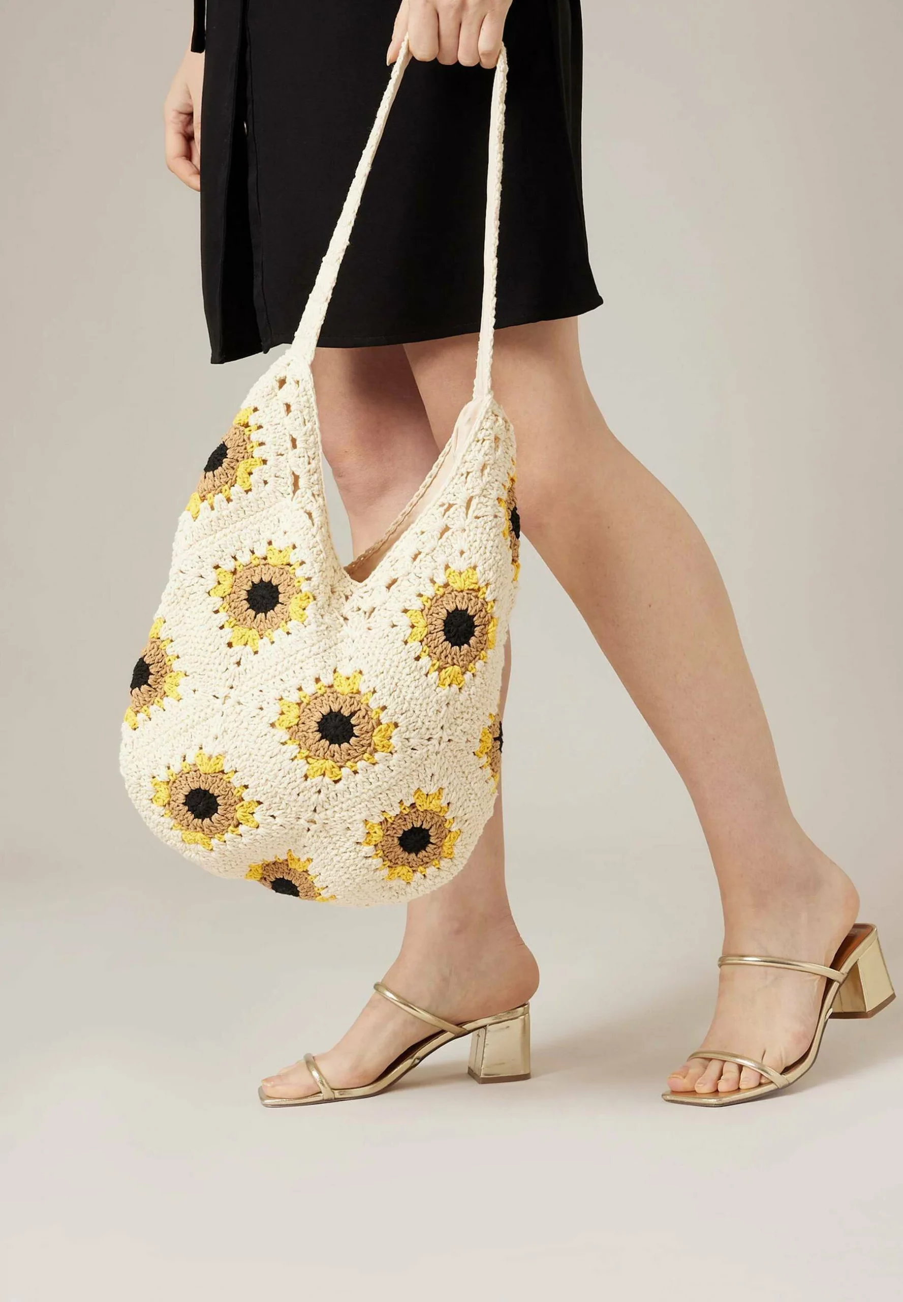 Craquez pour ce magnifique sac en crochet au charme bohème et lumineux. Son motif de tournesols apporte une touche solaire et originale qui sublime facilement toutes vos tenues.