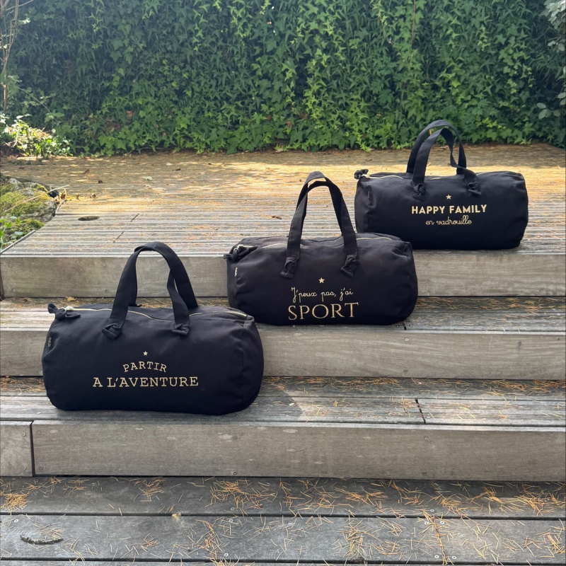 Sac polochon ” J’peux pas j’ai sport” dans son coloris noir et son message pailleté or, pour transporter vos essentiels.