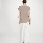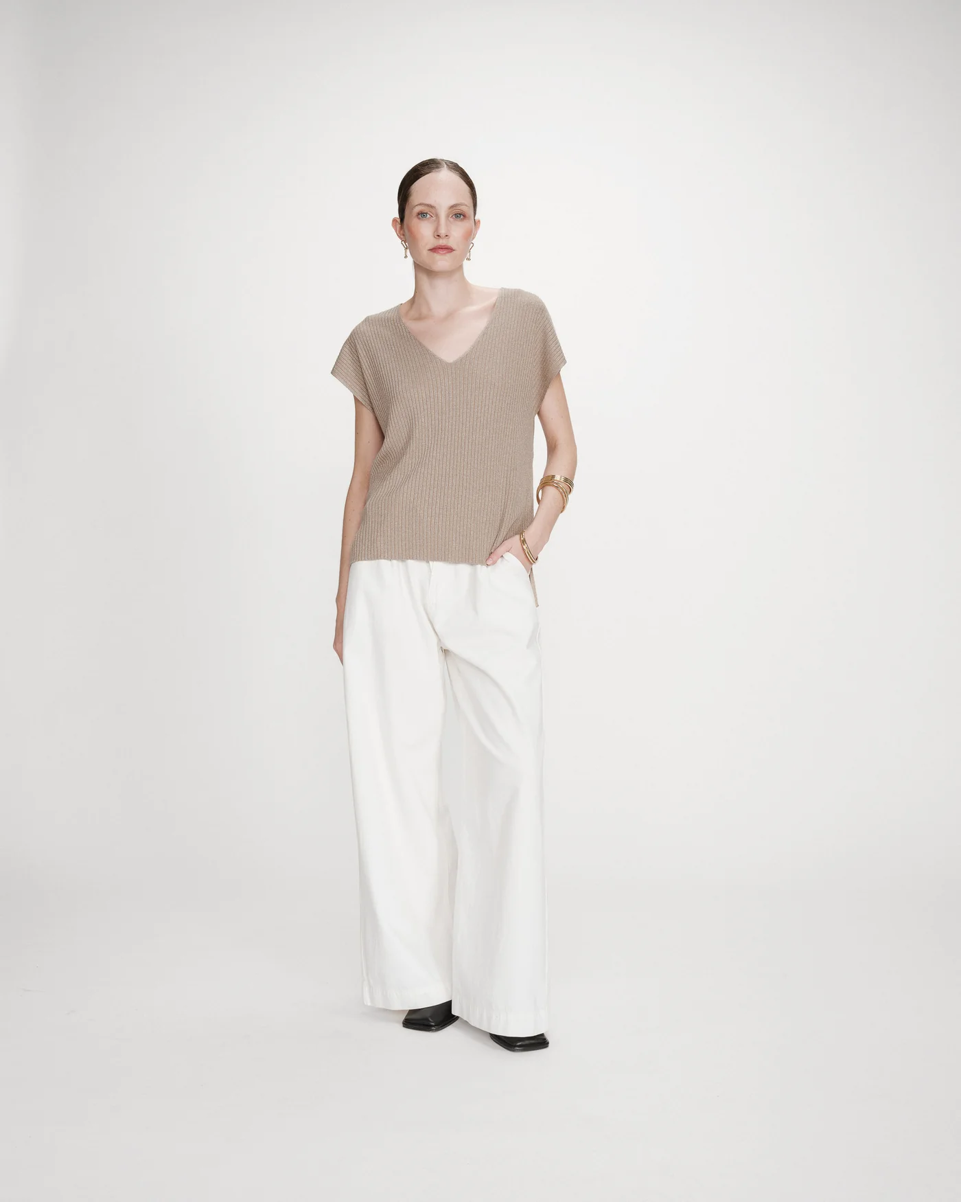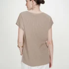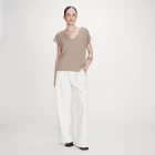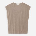 Le t-shirt en lurex VAPORO est un top sans manches fabriqué en maille côtelée. Le fil fin, composé de polyester recyclé et de lurex, offre un aspect lumineux et étincelant. La coupe large du top VAPORO et son encolure en V mettent en valeur la silhouette féminine.