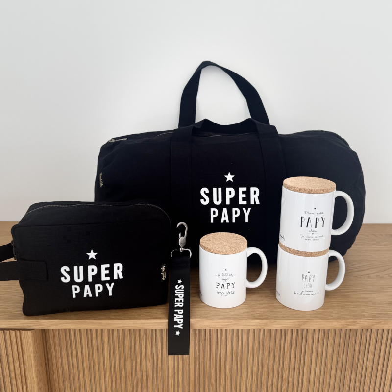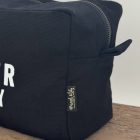 Adorable trousse de toilette à offrir à votre Super papy, confectionnée avec une jolie toile de coton noire certifiée OEKO-TEX® entièrement doublée avec sa dragonne pour la transporter partout.